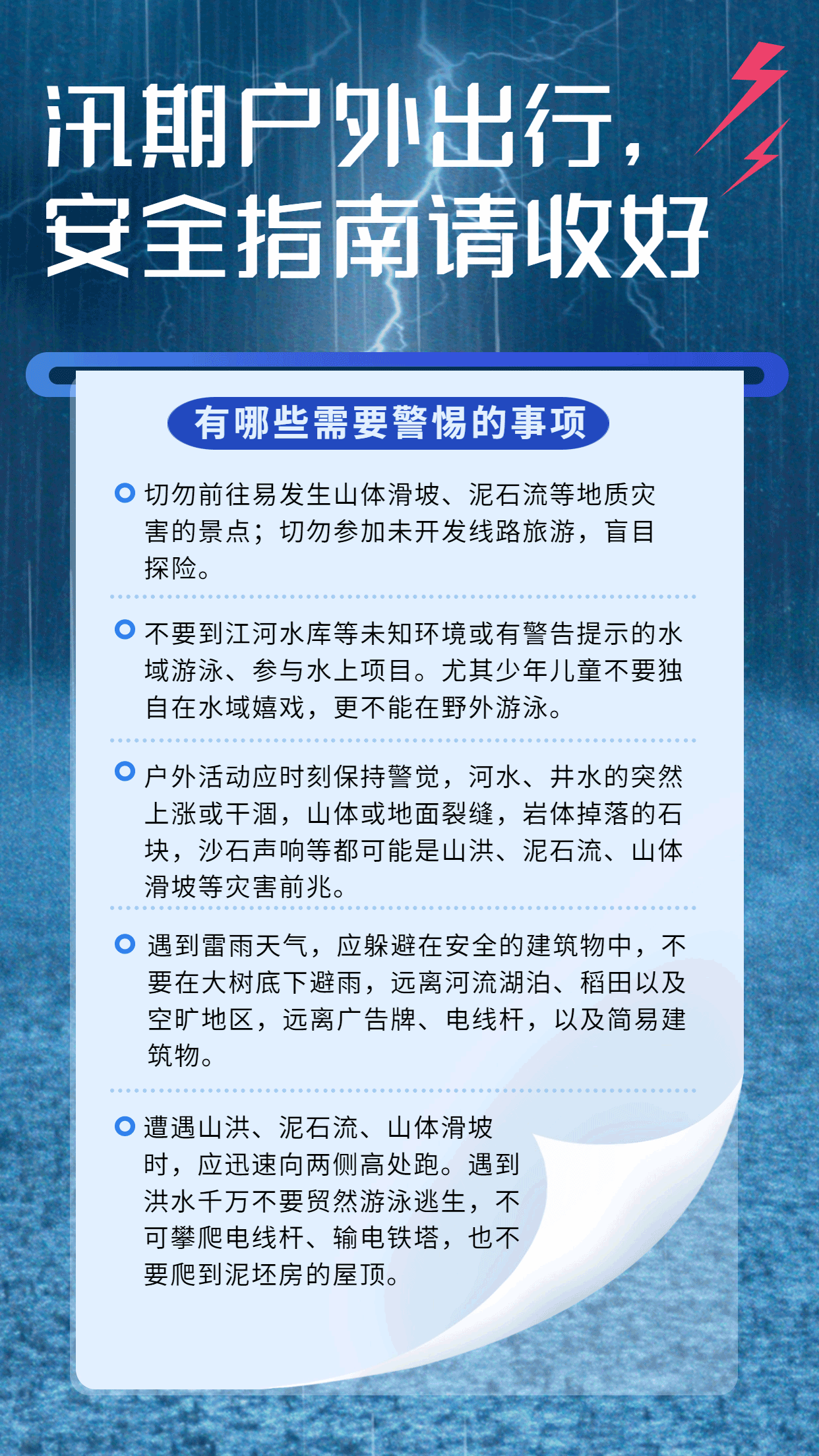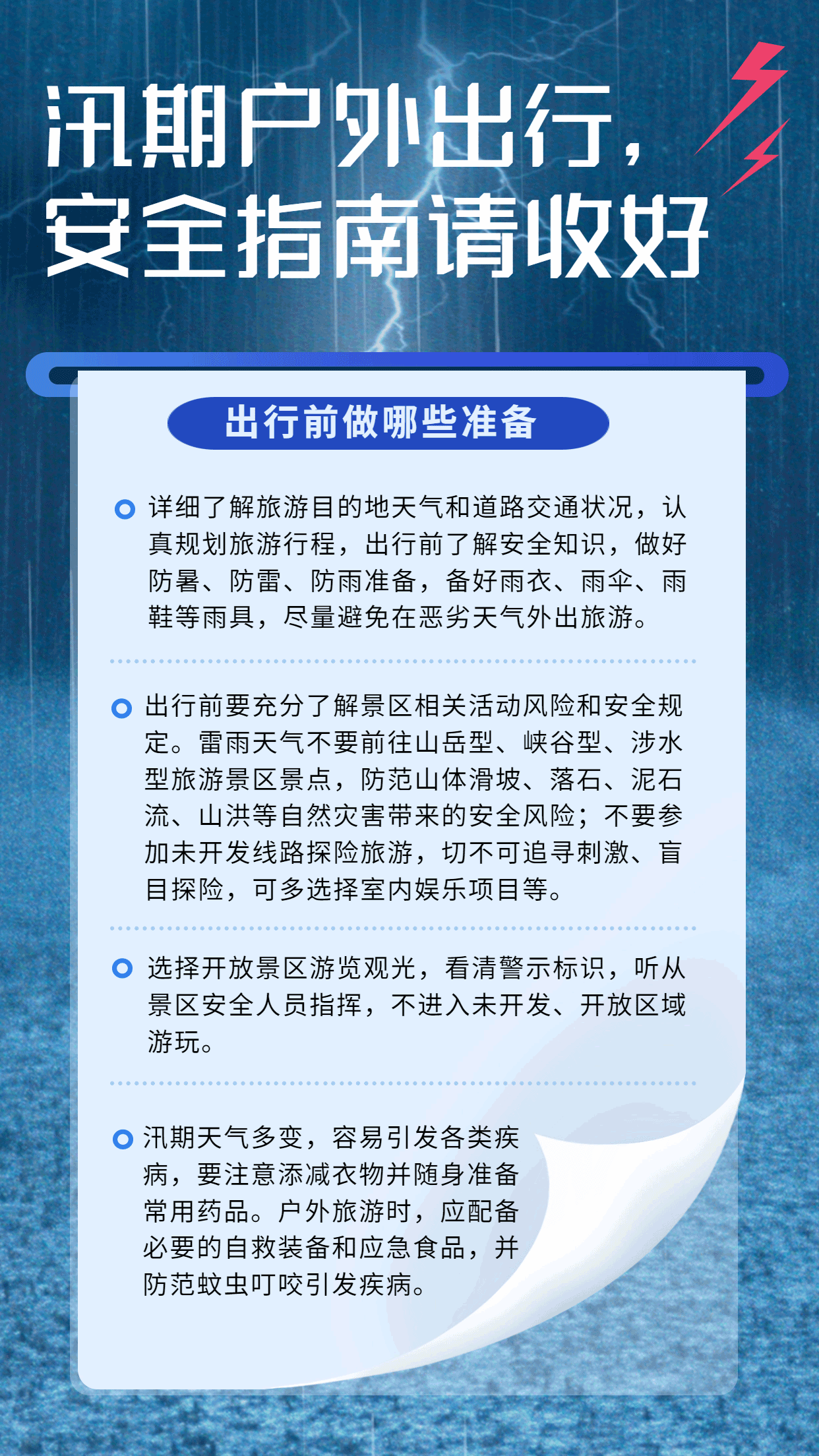 當(dāng)前正值暑假旅游旺季,也是汛期災(zāi)害事故易發(fā)多發(fā)時期。外出游玩時需要做好哪些安全防范工作?出游時又有哪些需要警惕的事項?一起來了解。