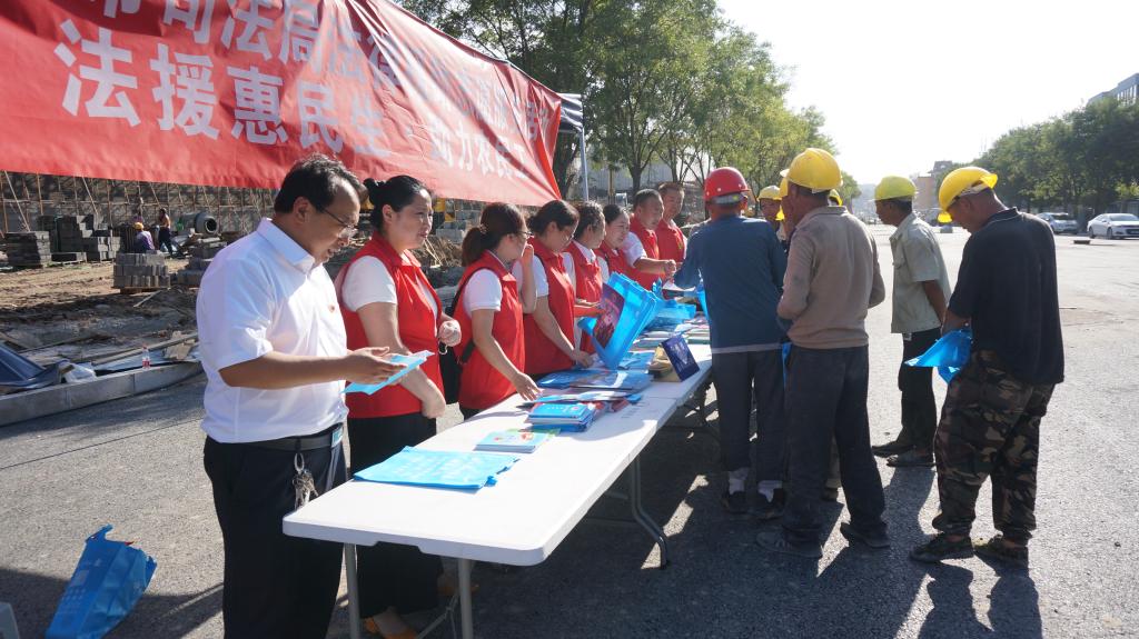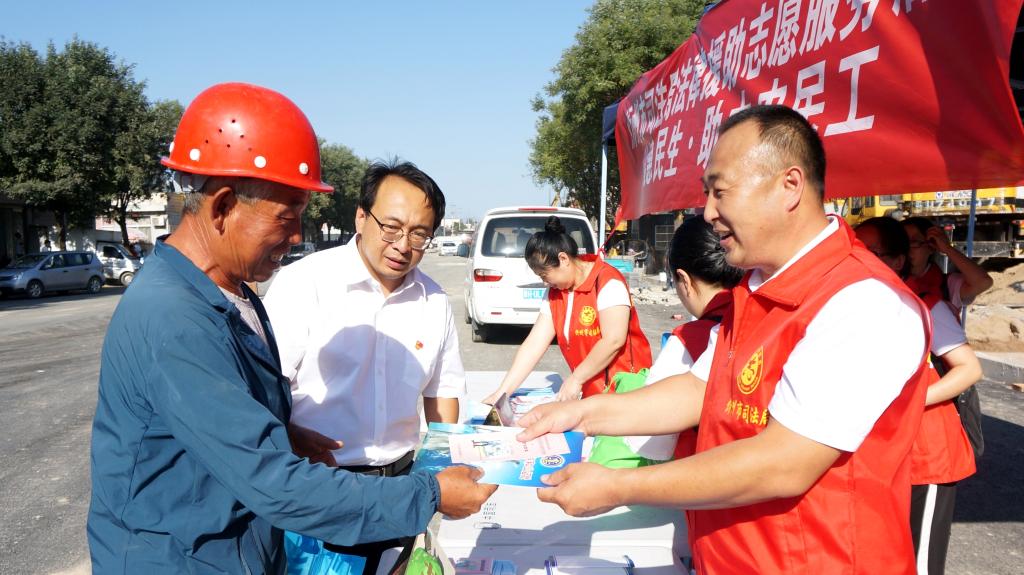 為深入貫徹落實(shí)習(xí)近平新時(shí)代中國(guó)特色社會(huì)主義思想和黨的十九大及十九屆二中、三中、四中全會(huì)精神,貫徹落實(shí)《保障農(nóng)民工工資支付條例》和國(guó)家、山西省關(guān)于農(nóng)民工服務(wù)工作的部署,切實(shí)加強(qiáng)我市農(nóng)民工安全生產(chǎn)意識(shí),提高農(nóng)民工的維權(quán)意識(shí)和維權(quán)能力,8月13日下午,忻州市司法局組織市法律援助中心、公證處、律師事務(wù)所、司法鑒定中心組成法律援助志愿服務(wù)隊(duì),走進(jìn)忻州古城建筑工地現(xiàn)場(chǎng),開展了“法援惠民生·助力農(nóng)民工”法律援助志愿服務(wù)活動(dòng)。