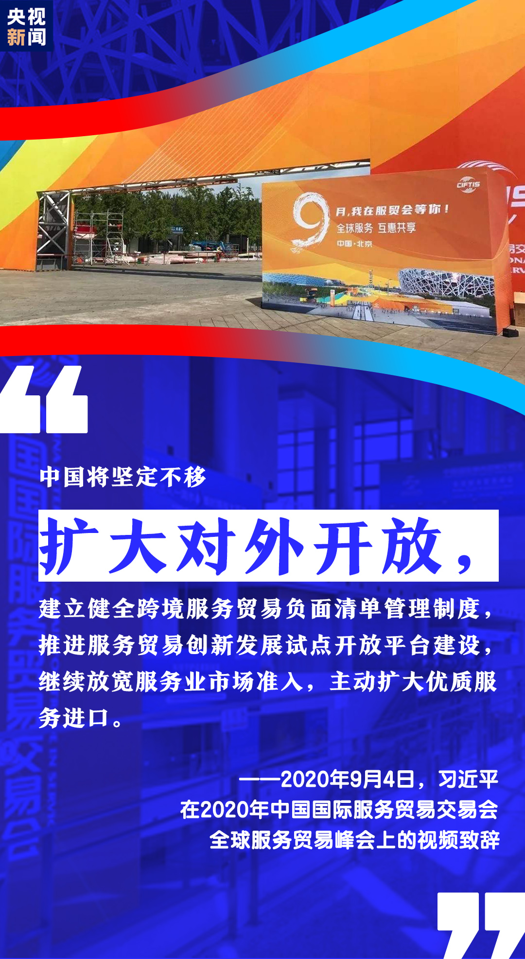 習(xí)近平表示,中國(guó)舉辦2020年中國(guó)國(guó)際服務(wù)貿(mào)易交易會(huì),就是搭建起平臺(tái)和橋梁,讓各國(guó)人民充分展示服務(wù)貿(mào)易領(lǐng)域新發(fā)展新突破,共同享受人類社會(huì)發(fā)展進(jìn)步新技術(shù)新成果。