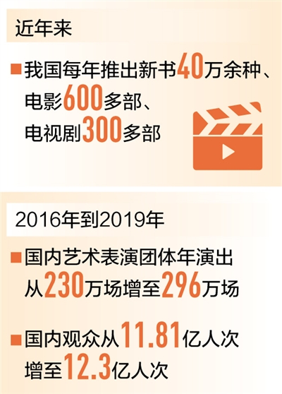 在作品質(zhì)量提升的同時,我國文化產(chǎn)品的供給能力也在持續(xù)增強。目前我國每年推出新書40萬余種、童書4萬多種、電影600多部、電視劇300多部、動漫400多部……眾多文化產(chǎn)品的生產(chǎn)規(guī)模位居世界前列。演出市場持續(xù)繁榮,2016年到2019年,國內(nèi)藝術(shù)表演團體年演出場次從230萬場增長至296萬場,國內(nèi)觀眾從11.81億人次增加至12.3億人次,其中農(nóng)村觀眾超過7億人次。