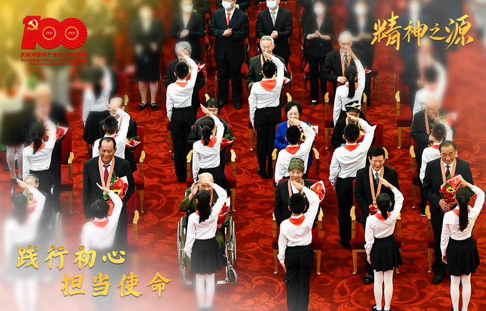 6月29日,慶祝中國(guó)共產(chǎn)黨成立100周年“七一勛章”頒授儀式在北京人民大會(huì)堂金色大廳隆重舉行。這是少先隊(duì)員向勛章獲得者獻(xiàn)花,敬禮致意。