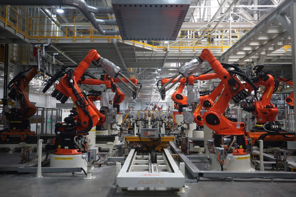 黃色的機械臂上下?lián)]舞,無人搬運車穿梭不停,焊裝線火花四濺,配備了高精度傳感器和先進機器視覺系統(tǒng)的焊接機器人正在精準焊接車身部件……