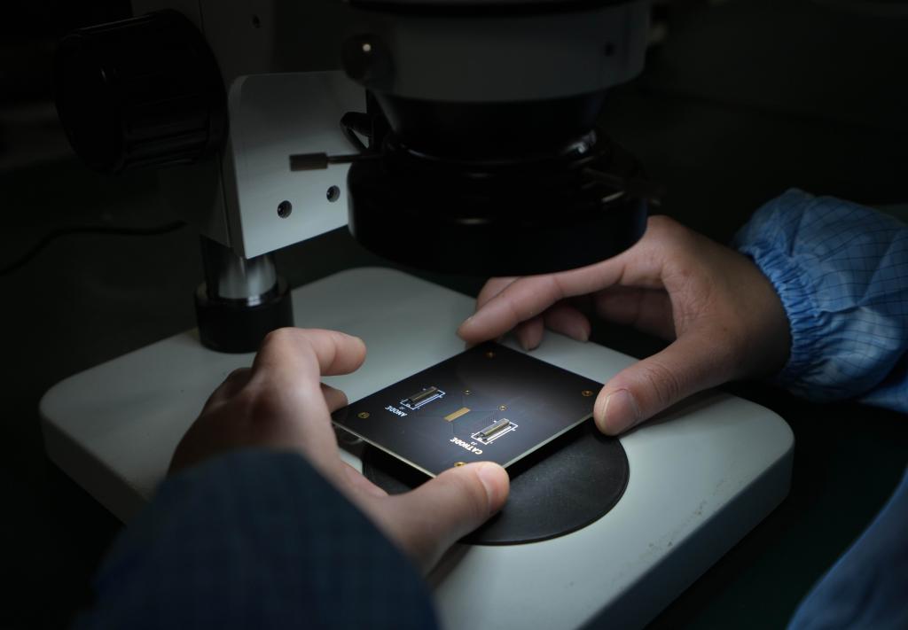 6月2日,工作人員在蘇州光電技術(shù)研究院的封裝測試公共服務(wù)平臺車間內(nèi)檢測一塊激光雷達芯片。新華社記者 李尕 攝