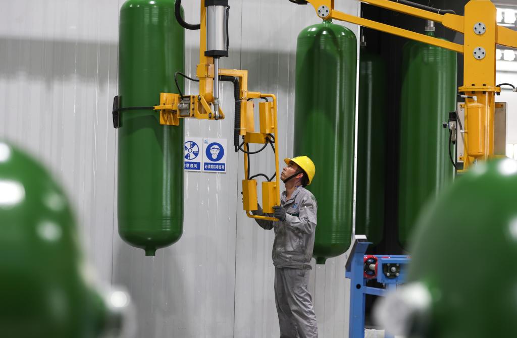 5月31日,一名工作人員在江蘇國富氫能技術(shù)裝備股份有限公司的儲氫罐生產(chǎn)車間內(nèi)作業(yè)。新華社記者 楊磊 攝