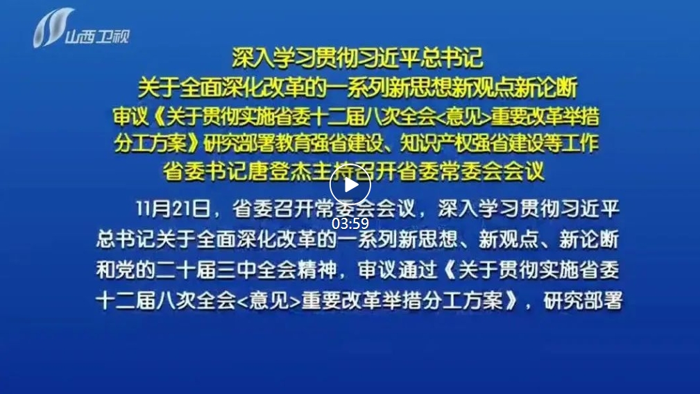 山西日?qǐng)?bào)報(bào)道 11月21日,省委召開(kāi)常委會(huì)會(huì)議,深入學(xué)習(xí)貫徹習(xí)近平總書(shū)記關(guān)于全面深化改革的一系列新思想、新觀點(diǎn)、新論斷和黨的二十屆三中全會(huì)精神,審議通過(guò)《關(guān)于貫徹實(shí)施省委十二屆八次全會(huì)〈意見(jiàn)〉重要改革舉措分工方案》,研究部署教育強(qiáng)省建設(shè)、知識(shí)產(chǎn)權(quán)強(qiáng)省建設(shè)等工作。省委書(shū)記唐登杰主持會(huì)議并講話。