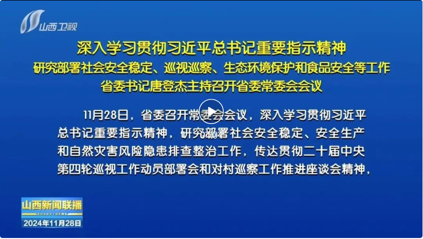 山西日?qǐng)?bào)報(bào)道 11月28日,省委召開(kāi)常委會(huì)會(huì)議,深入學(xué)習(xí)貫徹習(xí)近平總書(shū)記重要指示精神,研究部署社會(huì)安全穩(wěn)定、安全生產(chǎn)和自然災(zāi)害風(fēng)險(xiǎn)隱患排查整治工作,傳達(dá)貫徹二十屆中央第四輪巡視工作動(dòng)員部署會(huì)和對(duì)村巡察工作推進(jìn)座談會(huì)精神,聽(tīng)取全省打好污染防治攻堅(jiān)戰(zhàn)和加強(qiáng)食品安全監(jiān)管等情況匯報(bào)。省委書(shū)記唐登杰主持會(huì)議。