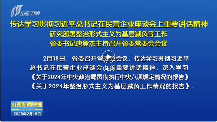 山西日?qǐng)?bào)報(bào)道 2月18日,省委召開(kāi)常委會(huì)會(huì)議,傳達(dá)學(xué)習(xí)貫徹習(xí)近平總書(shū)記在民營(yíng)企業(yè)座談會(huì)上的重要講話精神,深入學(xué)習(xí)《關(guān)于2024年中央政治局貫徹執(zhí)行中央八項(xiàng)規(guī)定情況的報(bào)告》《關(guān)于2024年整治形式主義為基層減負(fù)工作情況的報(bào)告》,傳達(dá)貫徹中央層面整治形式主義為基層減負(fù)專項(xiàng)工作機(jī)制會(huì)議精神,審議通過(guò)《關(guān)于進(jìn)一步深化農(nóng)村改革扎實(shí)推進(jìn)鄉(xiāng)村全面振興的實(shí)施意見(jiàn)》《山西省人大常委會(huì)2025年立法計(jì)劃》《政協(xié)山西省委員會(huì)2025年度協(xié)商計(jì)劃》《政協(xié)山西省委員會(huì)2025年度重點(diǎn)民主監(jiān)督計(jì)劃》。省委書(shū)記唐登杰主持會(huì)議。