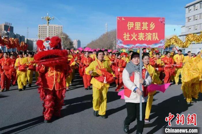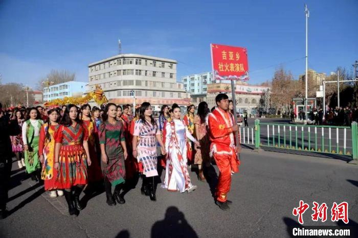 2月12日,農(nóng)歷正月初三,和田市舉行2024年“龍騰盛世·春滿萬家”社火活動,和田市伊里其鄉(xiāng)社火表演隊(duì)巡街。 張亞輝 攝
