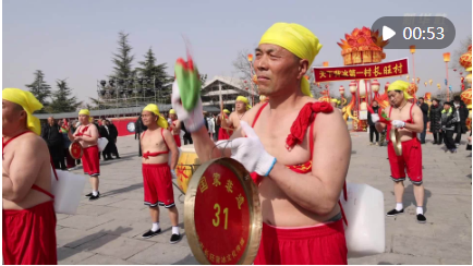 新春佳節(jié),在山西省永濟(jì)市鸛雀樓景區(qū),民間藝人們表演社火“背冰”,受到游客的熱烈歡迎。只見(jiàn)在凜冽的寒風(fēng)中,二十多名黃河漢子冒著零度左右的氣溫,身著短褲赤膊上陣,背著從黃河里撈起的大冰塊,在鑼鼓伴奏下列隊(duì)前行,展示了黃河漢子彪悍勇敢、不畏艱難困苦的鐵骨精神,寄托了勞動(dòng)人民祛邪、避災(zāi)、祈福的美好愿景。