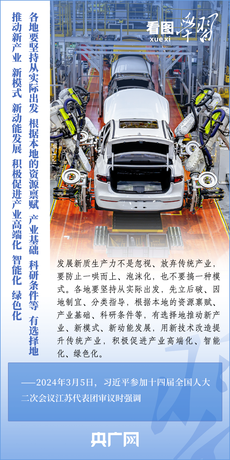 3月5日,十四屆全國人大二次會議正式開幕。5日下午,習近平總書記參加他所在的江蘇代表團審議時強調,要牢牢把握高質量發(fā)展這個首要任務,因地制宜發(fā)展新質生產力。發(fā)展新質生產力不是忽視、放棄傳統(tǒng)產業(yè),要防止一哄而上、泡沫化,也不要搞一種模式。一起來學習!