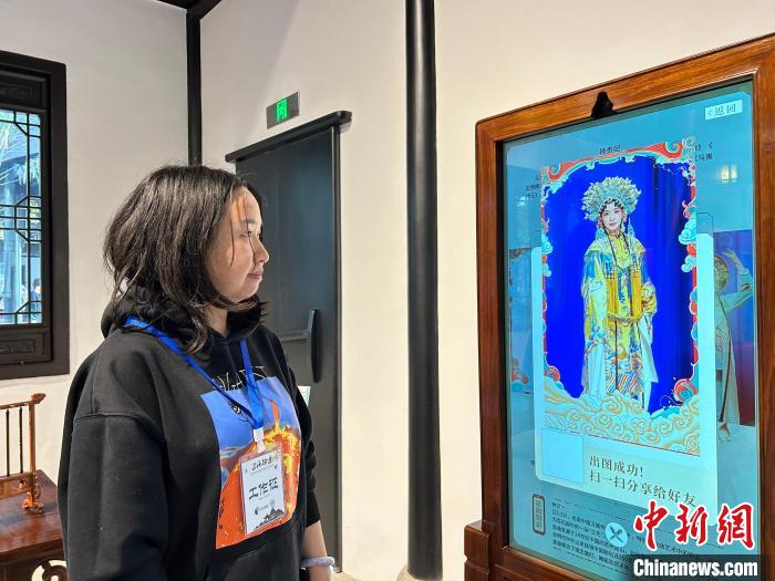 近期,蘇州古城32號(hào)街坊的江蘇按察使署舊址舉辦“匠海拾遺—沉浸式名城非遺文化體驗(yàn)展”。圖為工作人員展示昆曲AI換臉拍照體驗(yàn)過程。國(guó)璇 攝