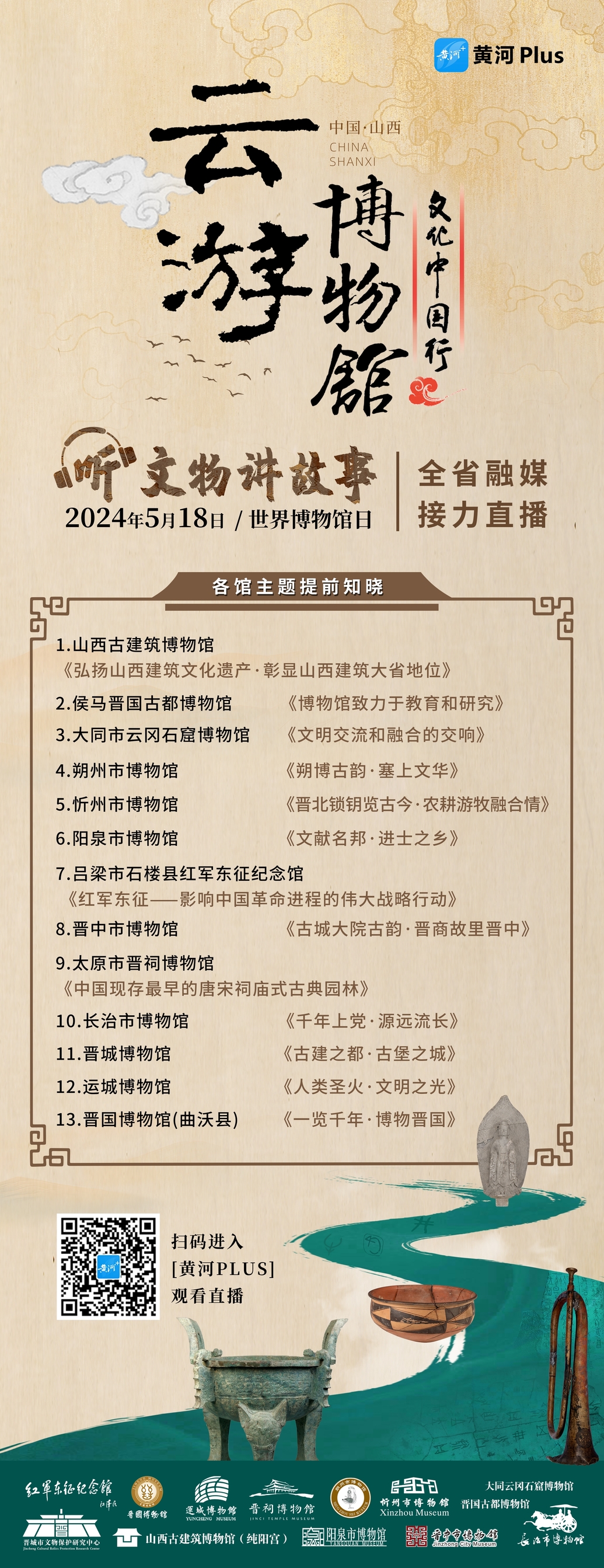 5月18日是世界博物館日,山西廣播電視臺(tái)視聽融媒體中心聯(lián)合全省11市廣電融媒體平臺(tái),共同發(fā)起《云游博物館 聽文物講故事》全省融媒接力直播活動(dòng),邀請(qǐng)文物專家、學(xué)者、博物館工作人員,帶大家一起云游太原市晉祠博物館、運(yùn)城博物館、大同市云岡石窟博物館、朔州市博物館、忻州市博物館、陽(yáng)泉市博物館、晉中市博物館、長(zhǎng)治市博物館、晉城博物館、侯馬晉國(guó)古都博物、晉國(guó)博物館(曲沃縣)、呂梁市石樓縣紅軍東征紀(jì)念館、山西古建筑博物館等13座特色博物館,圍繞13個(gè)博物館不同的主題,用線上直播的形式,講述藏品背后的文明密碼,助力公眾加深對(duì)博物館的了解,鑒賞山西豐富的館藏文物,感受中華文明中的山西貢獻(xiàn)。