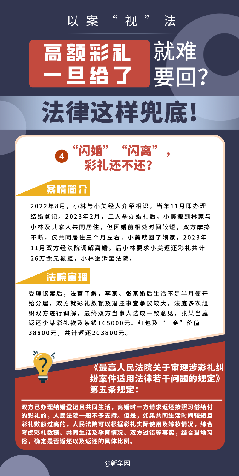 “五一”長假期間,各地迎來了婚禮高峰期,“彩禮”話題,尤其農(nóng)村高額彩禮現(xiàn)象備受關(guān)注。破解高價(jià)彩禮,在解決爭議的層面,司法盡了最大努力兜底。本期《以案“視”法》針對涉“高額彩禮”糾紛,帶大家學(xué)習(xí)相關(guān)法律知識。