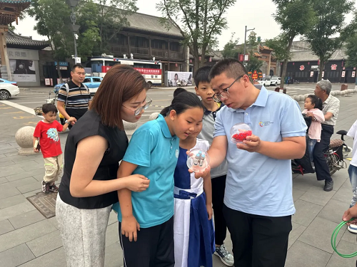 活動(dòng)現(xiàn)場(chǎng),在一個(gè)特殊的攤位上,由近到遠(yuǎn)分別擺放著“冰毒”“海洛因”“搖頭丸”等各種眼花繚亂的毒品仿真模型。“來(lái)來(lái)來(lái),走過(guò)路過(guò)不要錯(cuò)過(guò)!”“瞧一瞧,看一看!”禁毒社工在“攤位”前賣力吆喝著,一陣陣吆喝聲引來(lái)了眾多游客,游戲通過(guò)套圈的方式,組織游客套中現(xiàn)場(chǎng)的毒品模型并準(zhǔn)確說(shuō)出毒品名稱即可獲得扇子、手機(jī)支架、帆布包等獎(jiǎng)勵(lì)。