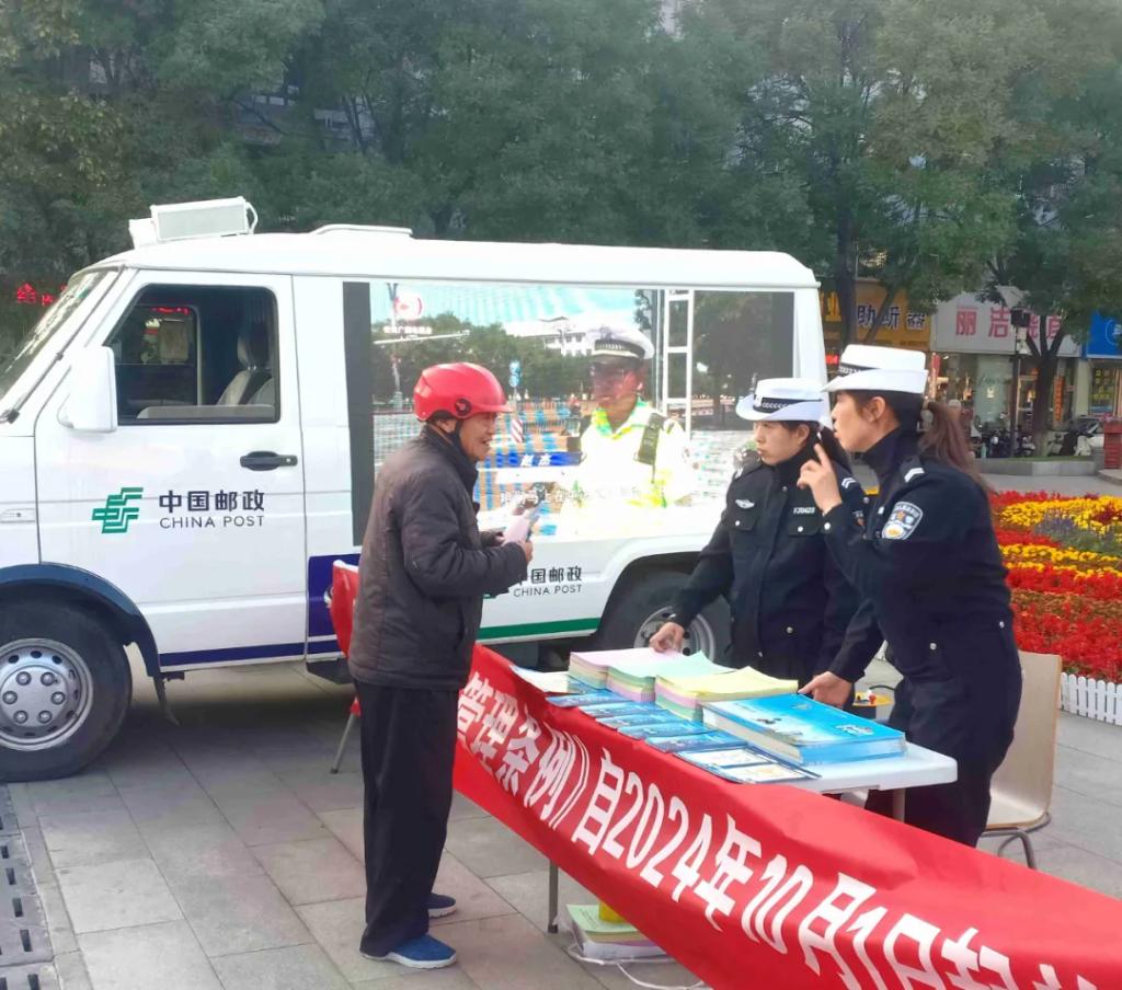 在人頭攢動的廣場上,“一盔一帶”宣傳展板、警郵直播車大屏幕吸引了過往群眾駐足觀看?!按髬專滦抻喌摹缎弥菔须妱榆嚬芾?xiàng)l例》已于本月1日起開始施行,您知道嗎?”“大叔,您這舊的電動自行車要抓緊時間登記備案、辦理臨時牌照,咱忻府區(qū)24個警郵合作電動自行車便民登記服務(wù)網(wǎng)點(diǎn)都能辦理過渡期臨牌”“騎乘電動自行車必須要佩戴安全頭盔,不能闖紅燈、逆行......”