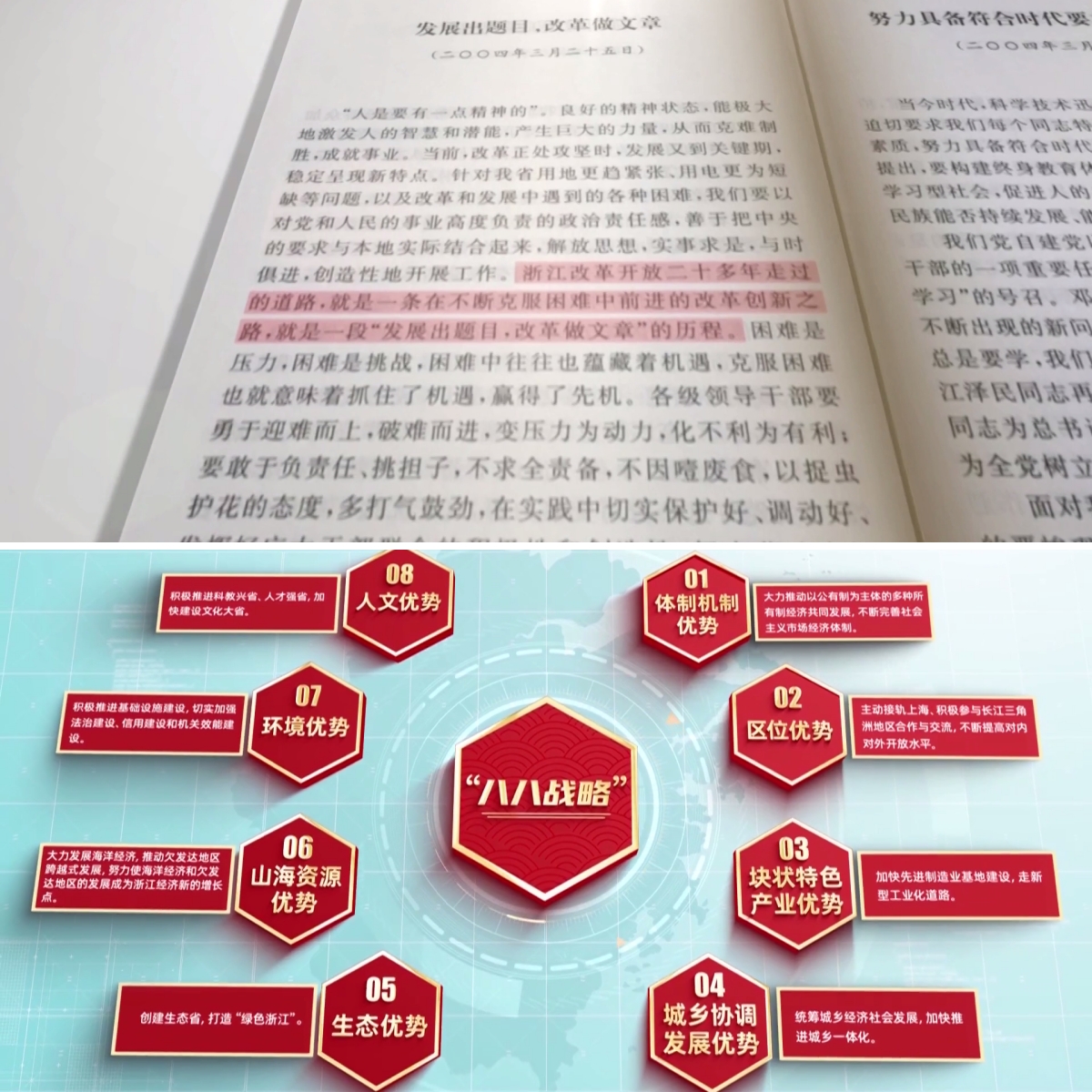 2003年7月10日,浙江省委十一屆四次全會上,習(xí)近平首次系統(tǒng)提出“八八戰(zhàn)略”。
