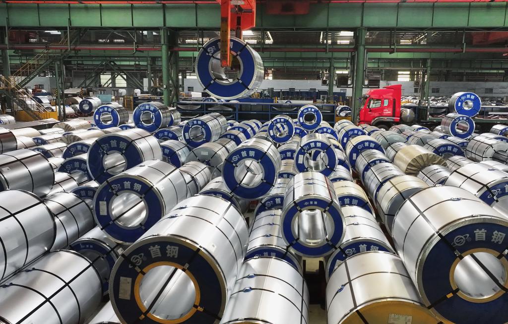首鋼京唐公司成品車(chē)間的吊裝設(shè)備在吊運(yùn)鋼板(無(wú)人機(jī)照片)。新華社記者 楊世堯 攝