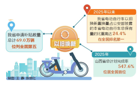 2025年以來(lái),我省電動(dòng)自行車以舊換新置換量占公安部披露的本省電動(dòng)自行車總保有量的比重高達(dá)24.4%,在全國(guó)排名第一。以2025年全國(guó)建議工作量計(jì)算,山西省的總計(jì)劃完成率達(dá)到547.6%,位居全國(guó)首位。