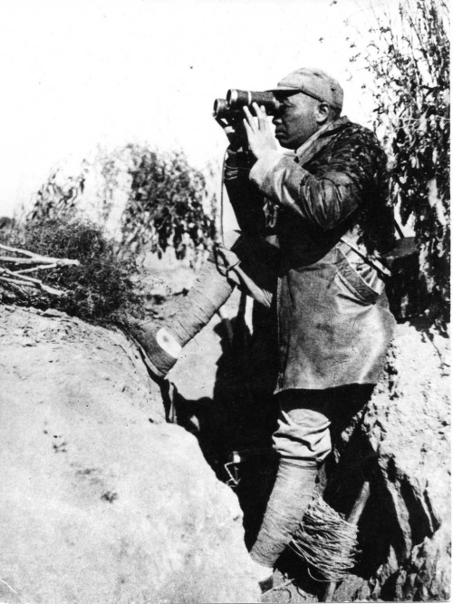 “誰敢橫刀立馬,唯我彭大將軍?!闭掌?,彭德懷大半個(gè)身體露在戰(zhàn)壕外,左腳踏在戰(zhàn)壕底,右腳蹬著戰(zhàn)壕前沿,坐靠在戰(zhàn)壕后沿上,手持望遠(yuǎn)鏡,神情專注地觀察戰(zhàn)況。