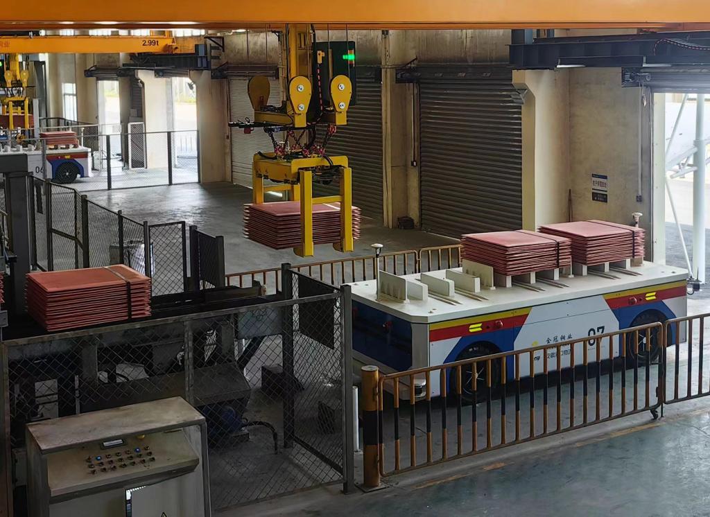 圖為金冠銅業(yè)分公司電解車(chē)間里,正在作業(yè)的AGV小車(chē)。(吳家富攝)